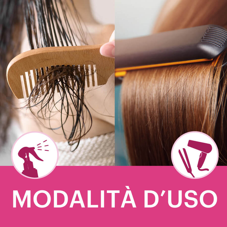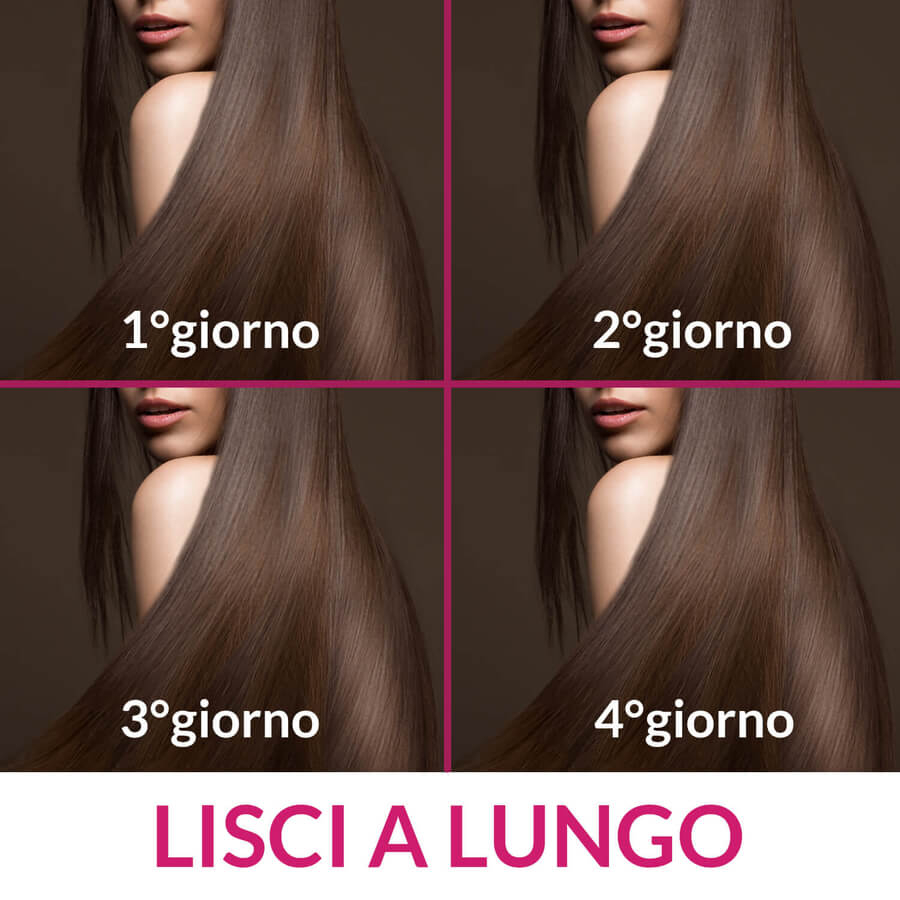 Adatto a tutti i tipi di capelli, anche quelli decolorati o che sono stati sottoposti a permanente, riduce i tempi richiesti dalla piega del 30% garantendoti un ottimo risultato con la piastra. Trattandosi di un trattamento temporaneo, l’effetto perfettamente liscio svanirà dopo qualche giorno, dandoti così la possibilità di rinnovare il tuo look come meglio desideri.