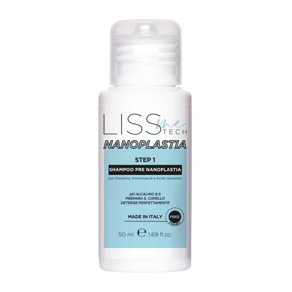 Shampoo Pre Nanoplastia a pH alcalino 8.5. Garantisce una perfetta detersione della cute e del capello, preparando la cuticola aperta, pronta ad assorbire il trattamento lisciante. La cheratina ripara e rinforza la fibra capillare, gli amminoacidi migliorano l'elasticità e l'acido ialuronico assicura un'idratazione profonda durante e dopo il trattamento