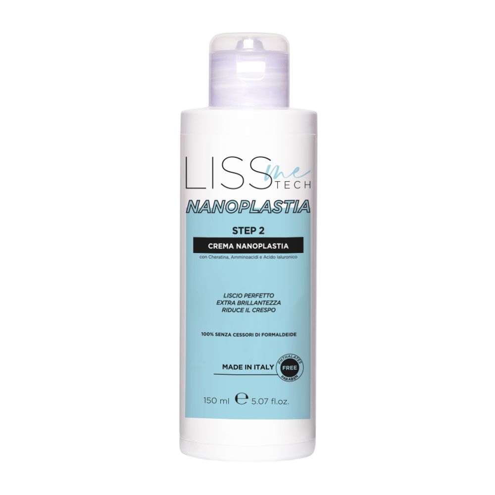 Crema Nanoplastia senza formaldeide. Agisce sulla fibra capillare riducendo il volume eccessivo, contrastando l’effetto crespo e donando brillantezza. La cheratina ripara e rinforza la fibra capillare, gli amminoacidi migliorano l'elasticità e l'acido ialuronico aiuta a mantenere il livello di idratazione ottimale, per capelli lisci, lucidi e setosi.