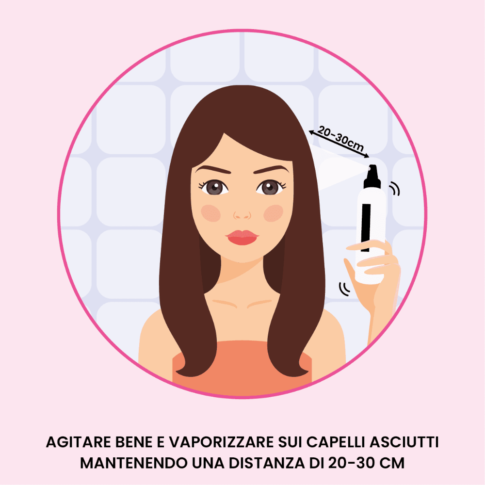 • Agitare bene e vaporizzare sui capelli asciutti mantenendo una distanza di circa 20-30 cm