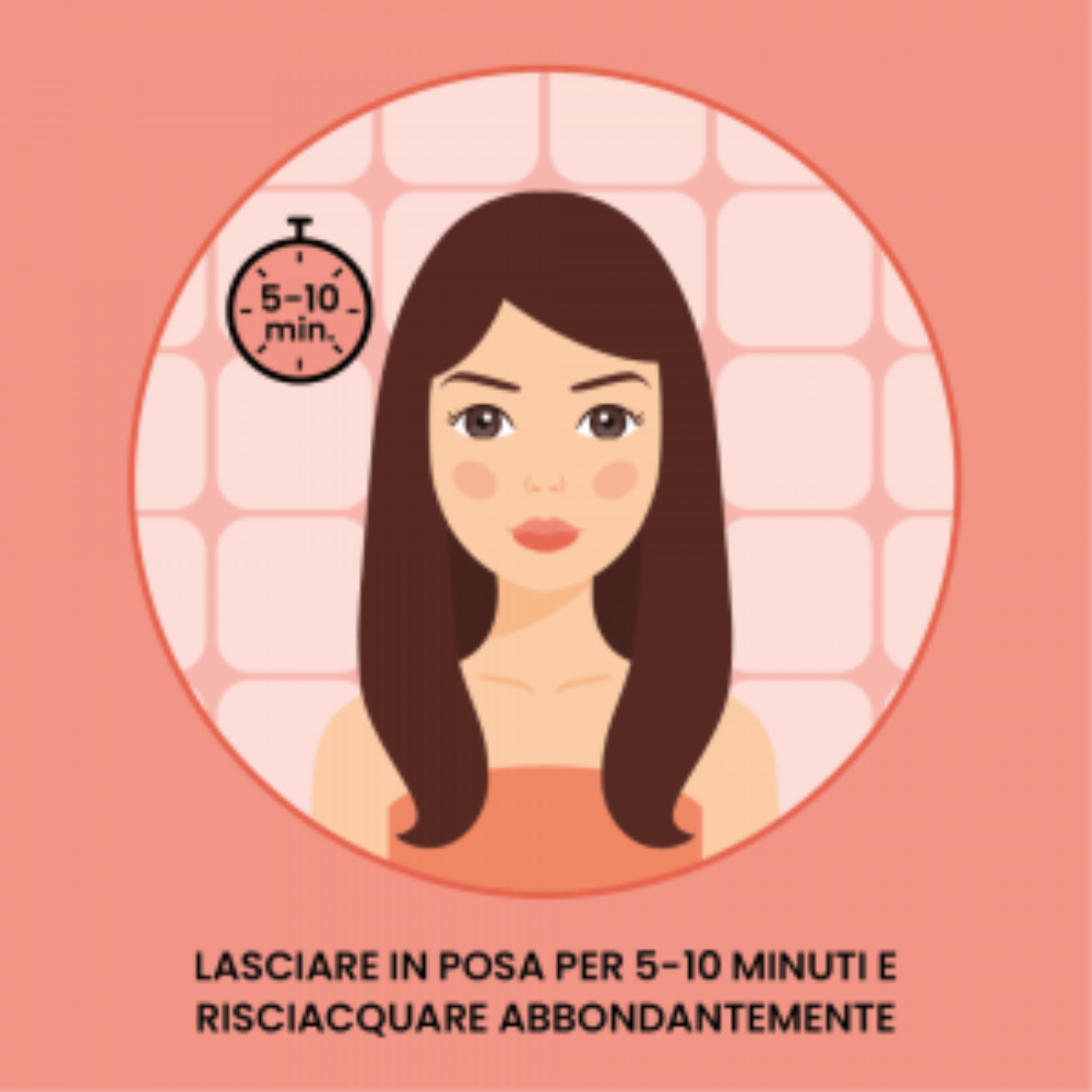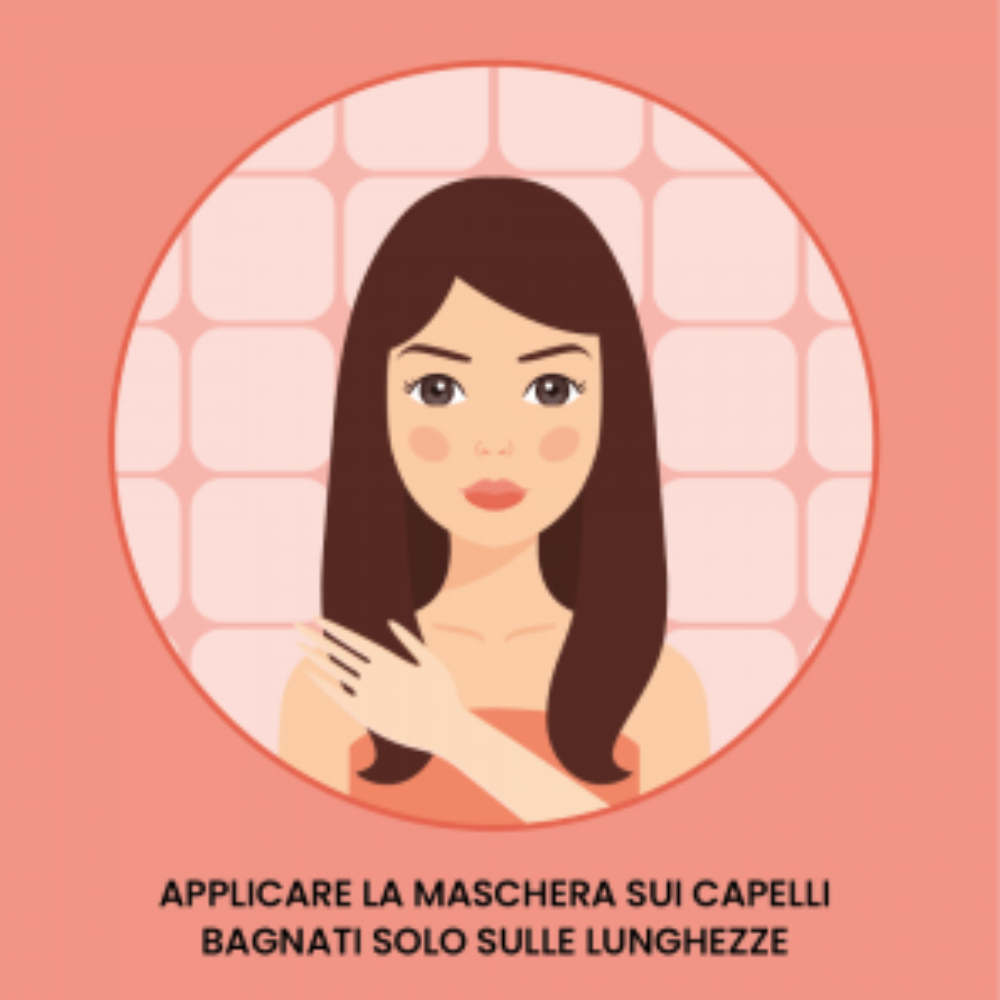 • A capelli lavati e tamponati, applicare la maschera su tutta la lunghezza del capello partendo dalle punte, massaggiare bene e lasciare in posa 5-10 minuti.