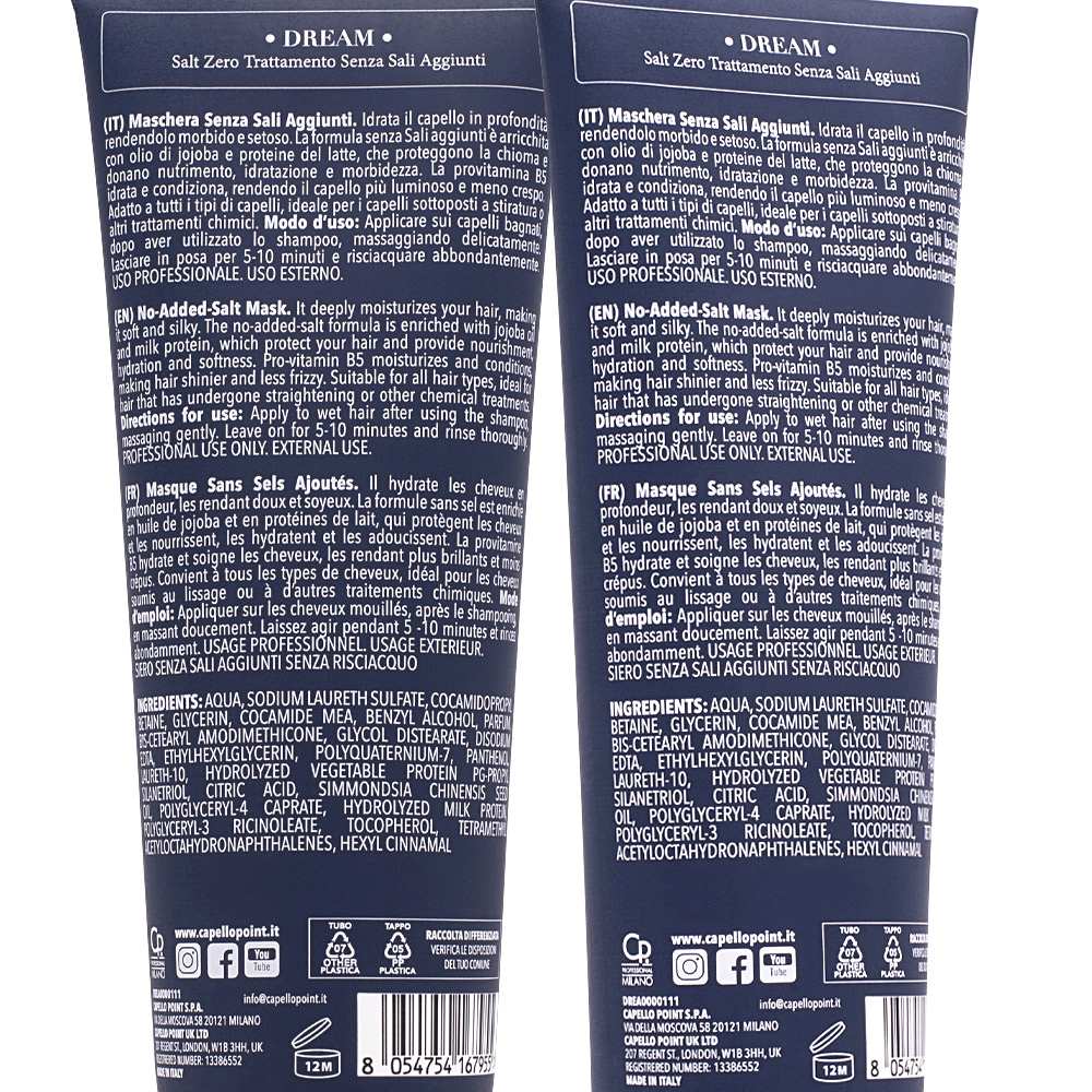 Idrata il capello il capello in profondità, rendendolo morbido e setoso. La formula senza Sali aggiunti è arricchita con olio di jojoba e proteine del latte, che proteggono la chioma e donano nutrimento, idratazione e morbidezza. La provitamina B5 idrata e condiziona, rendendo il capello più luminoso e meno crespo. Adatto a tutti i tipi di capelli, ideale per i capelli sottoposti a stiratura o altri trattamenti chimici.
