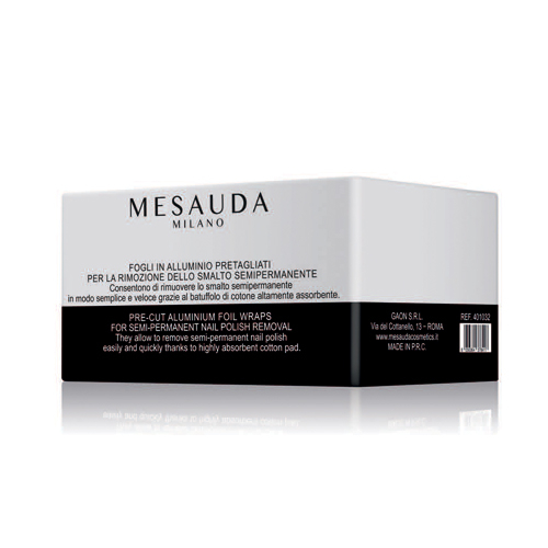 Mesauda Milano presenta le cartine in alluminio pretagliati, una pratica soluzione per eliminare rapidamente e senza sforzo lo smalto semipermanente. Ogni confezione contiene 100 cartine che, grazie al loro pad di cotone ad alta assorbenza, aiutano ad ammorbidire lo smalto con il Soak Off Remover, facilitandone la rimozione.