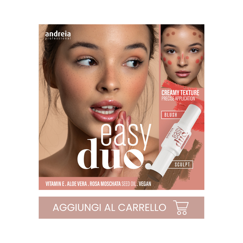 Per evitare che il viso appaia piatto e privo di espressione dopo l'applicazione dei prodotti coprenti, è essenziale restituire tridimensionalità e un tocco di colore al volto. Per fortuna, l' Easy Duo Sculpt & Blush di Andreia Professional semplifica questo compito unendo contouring e blush in un unico formato stick. La texture cremosa e liscia, arricchita con olio di rosa moscheta e aloe vera, scivola sulla pelle offrendo una sensazione rinfrescante. La parte dedicata allo "sculpt" va applicata sotto l'osso zigomatico e lungo la linea della mascella per definire i tratti, mentre la parte blush va sfumata verso le tempie per un effetto lifting immediato.
