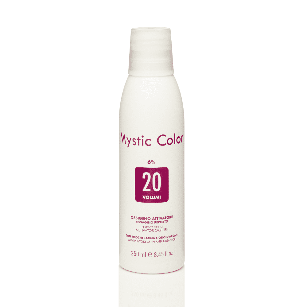 • Mystic Emulsione ossidante 20 volumi 250 ml: Attivatore del fissaggio per la colorazione, formulato per essere miscelato con le colorazioni professionali Mystic Color, Vera Color e 10Perm. Garantisce un risultato ricco e intenso e prolunga la durata del colore. Formato 250 ml