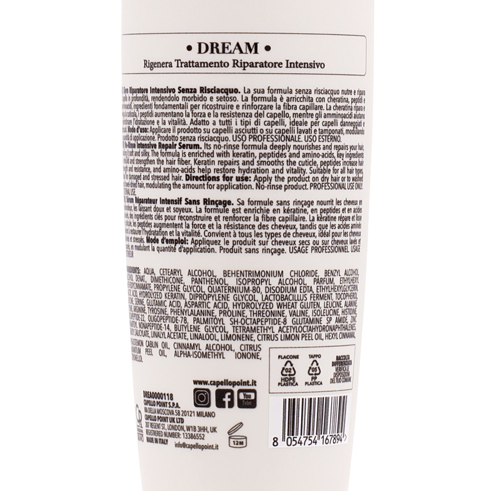 La sua formula senza risciacquo nutre e ripara il capello in profondità, rendendolo morbido e setoso. La formula è arricchita con cheratina, peptidi e amminoacidi, ingredienti fondamentali per ricostruire e rinforzare la fibra capillare. La cheratina ripara e leviga la cuticola, i peptidi aumentano la forza e la resistenza del capello, mentre gli amminoacidi aiutano a ripristinare l’idratazione e la vitalità. Adatto a tutti i tipi di capelli, ideale per capelli danneggiati e stressati.