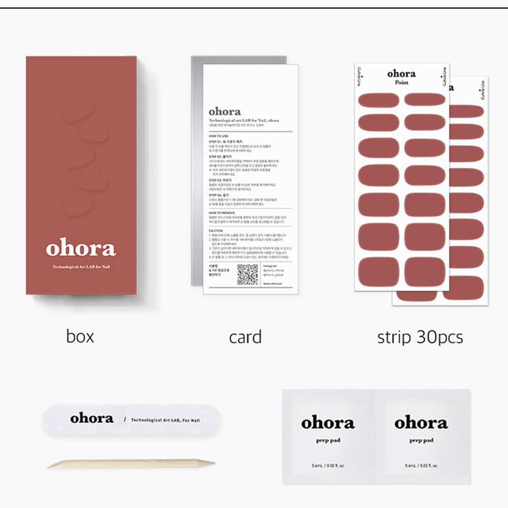 Gli adesivi Ohora sono composti da una morbida pellicola adesiva, realizzati in gel pre-polimerizzato al 60%, facilmente e perfettamente modellabile per adattarsi sulle unghie delle mani. Il loro design unico, leggermente curvato a forma di C permette una facile adesione al letto ungueale. Risultato: effetto unghie naturali.