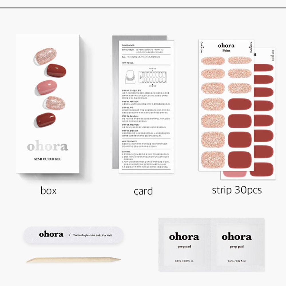 Gli adesivi Ohora sono composti da una morbida pellicola adesiva, realizzati in gel pre-polimerizzato al 60%, facilmente e perfettamente modellabile per adattarsi sulle unghie delle mani. Il loro design unico, leggermente curvato a forma di C permette una facile adesione al letto ungueale. Risultato: effetto unghie naturali.