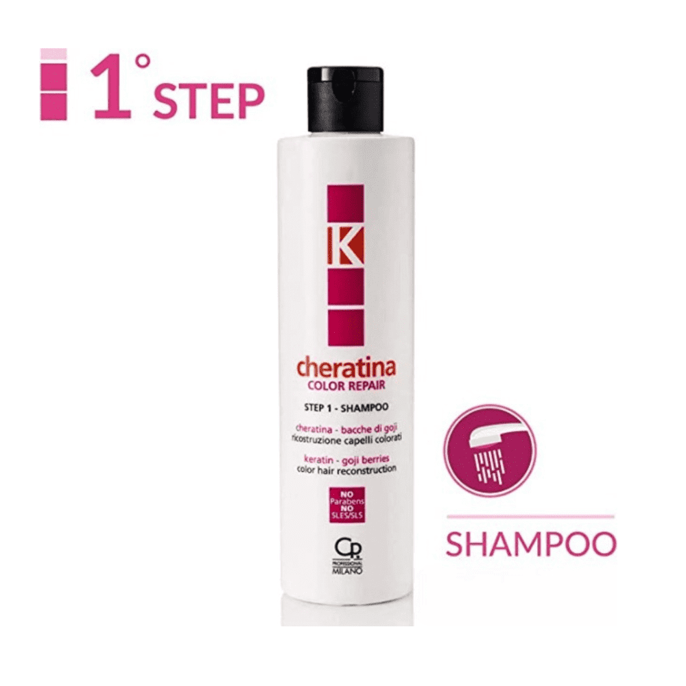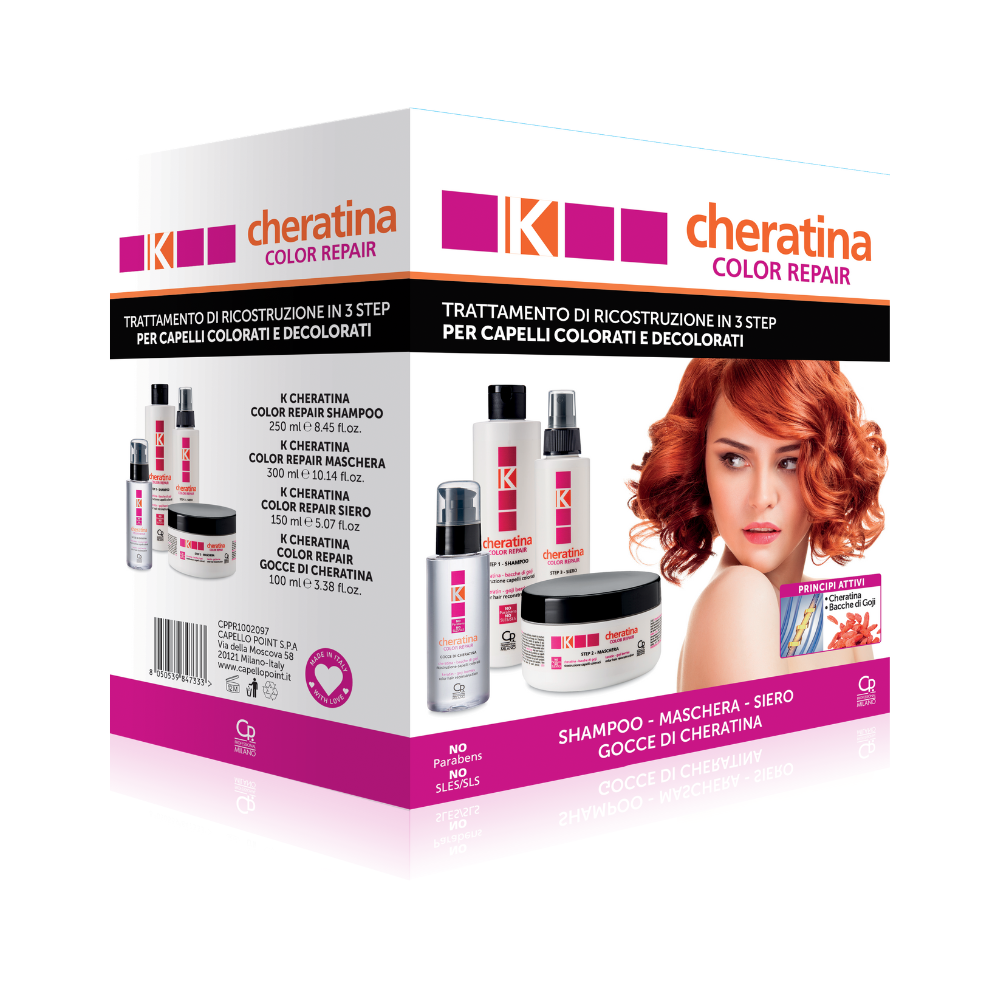 Il kit ricostruzione mirato al trattamento dei capelli colorati a marchio K-Cheratina comprende 4 prodotti, tutti a base di cheratina e bacche di goji:
