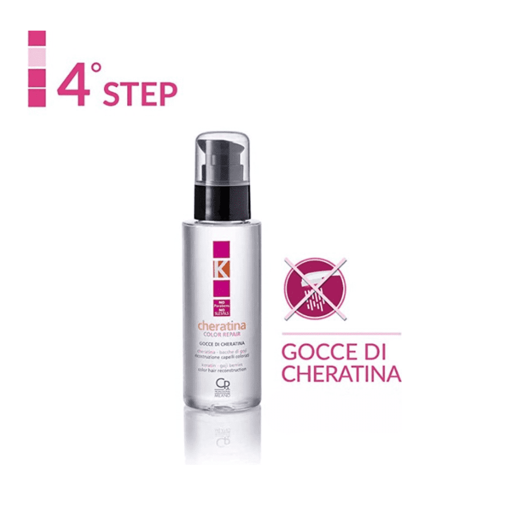 Puoi prolungare gli effetti e i risultati del trattamento applicando le gocce di cheratina Color Repair ogni giorno su capelli umidi o asciutti.